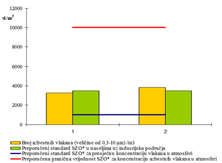 Slika 3 – Analiza atmosfere 2011. godine u krugu tvornice Salonit d. d. na azbesta vlakna nakon obavljene sanacije. Broj azbestnih vlakana veličine 0,3 – 10 mikrometara uz prikaz preporučenih standarda Svjetske zdravstvene organizacije za atmosferu naselja.